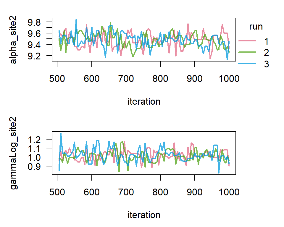 The first thing to do with the result of the model run is to check for convergence. Convergence means that the chains have reached a state were they are no longer influenced by their starting values, and they have thoroughly explored the parameter space. We also want to make sure that the chains are mixing well. This can be visually assessed with trace plots.