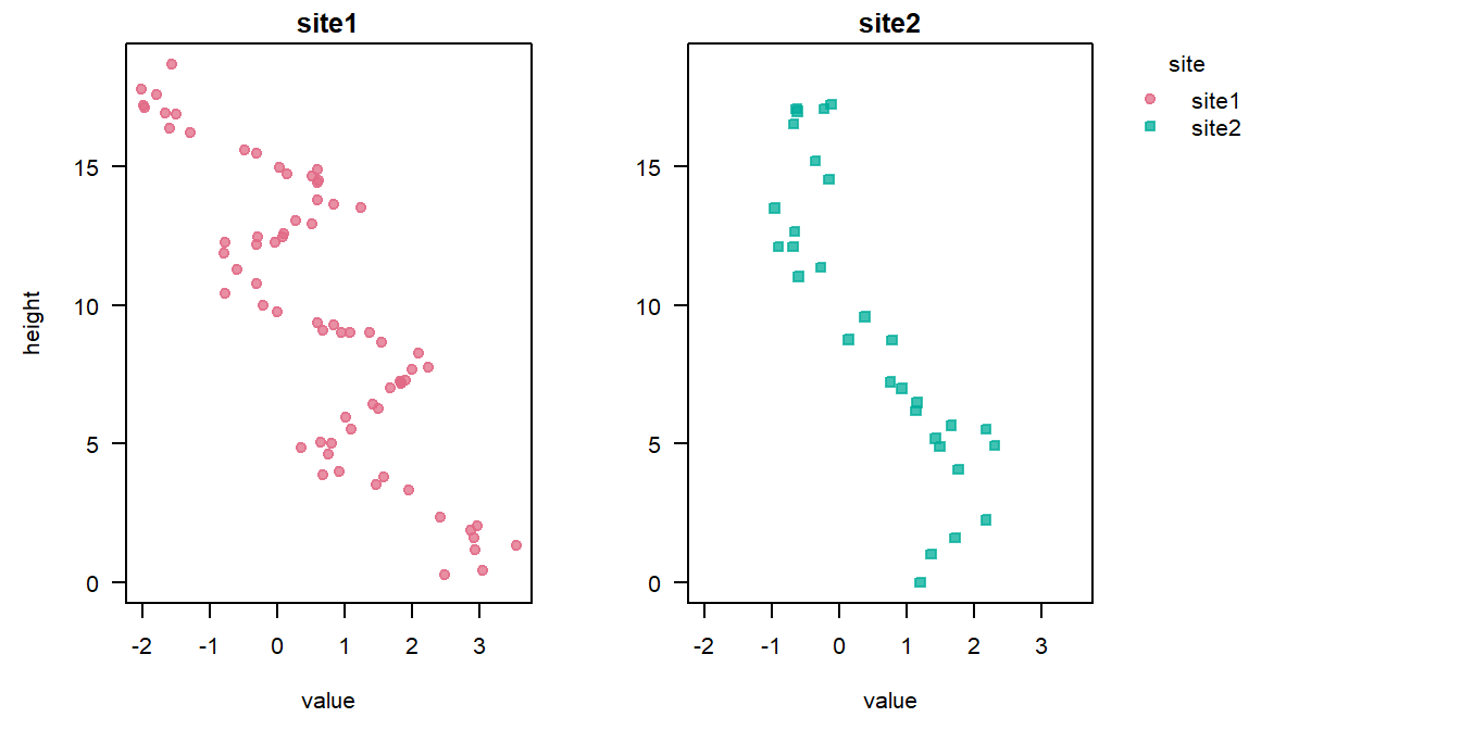 ## 1 1 6.728533 0.258385 6.256851 6.708606 7.218249This tells us that a height of 1 m at Site 2 would correspond to a mean height of 6.7 m at Site 1, for this alignment.